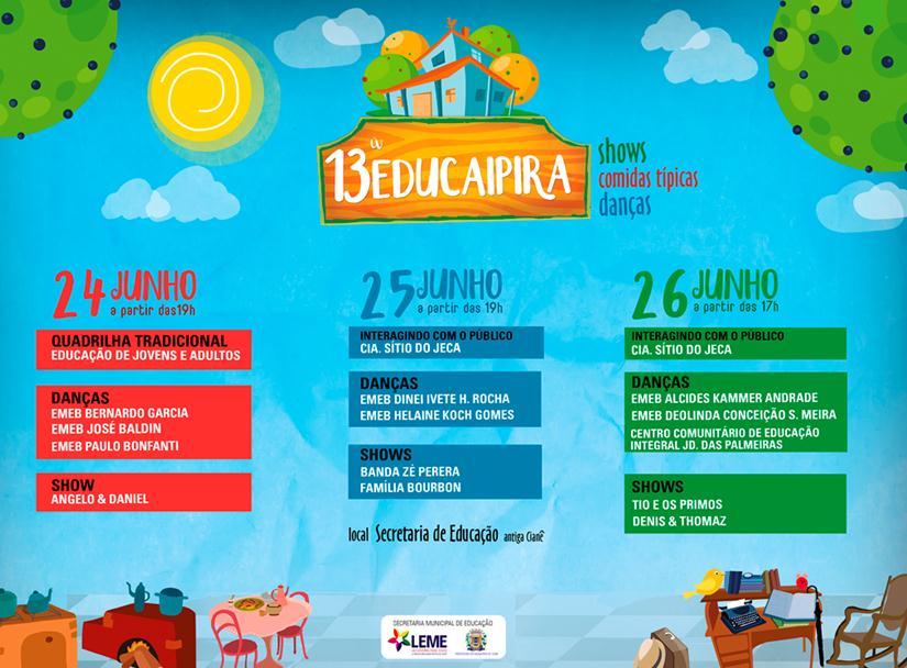 A Prefeitura do Município de Leme, através da Secretaria de Educação, realiza, no próximo final de semana, dias 24, 25 e 26 de junho, no espaço da antiga Cianê, a 13ª edição da Educaipira, tradicional Festa Junina promovida pela pasta. Na sexta e no sábado (12 e 13), o evento começa às 19h e, no domingo (14), a animação tem início a partir das 17h.